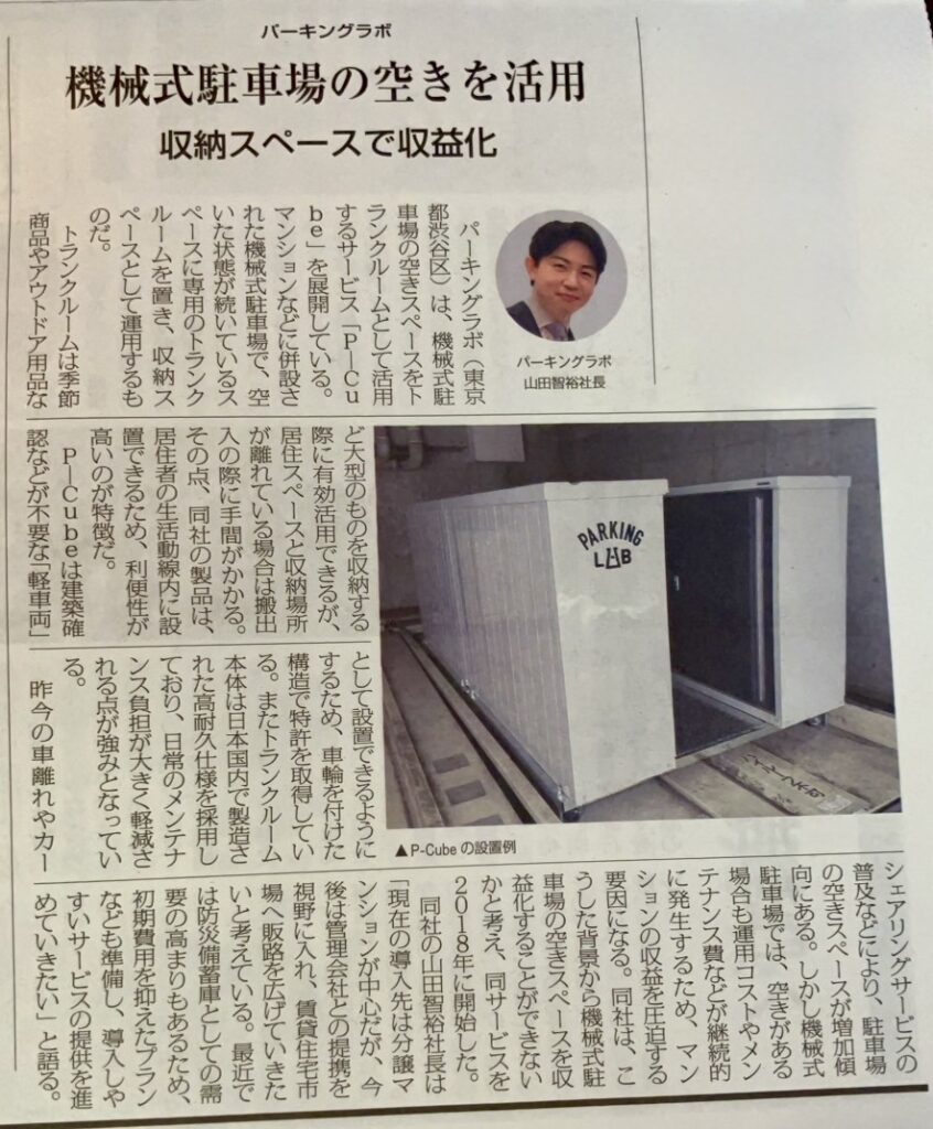 このたび、全国賃貸住宅新聞(2026年4月27日号)にて、立体駐車場収納ユニット「P-Cube」の取組みをご紹介いただきました。今後も、オーナー様・管理会社様の運用改善に貢献してまいります。
